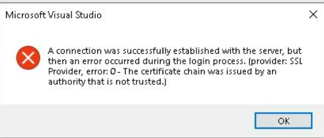 “A connection was successfully established with the server, but then an error occurred during the pre-login handshake. The certificate chain was issued by an authority that is not trusted.”